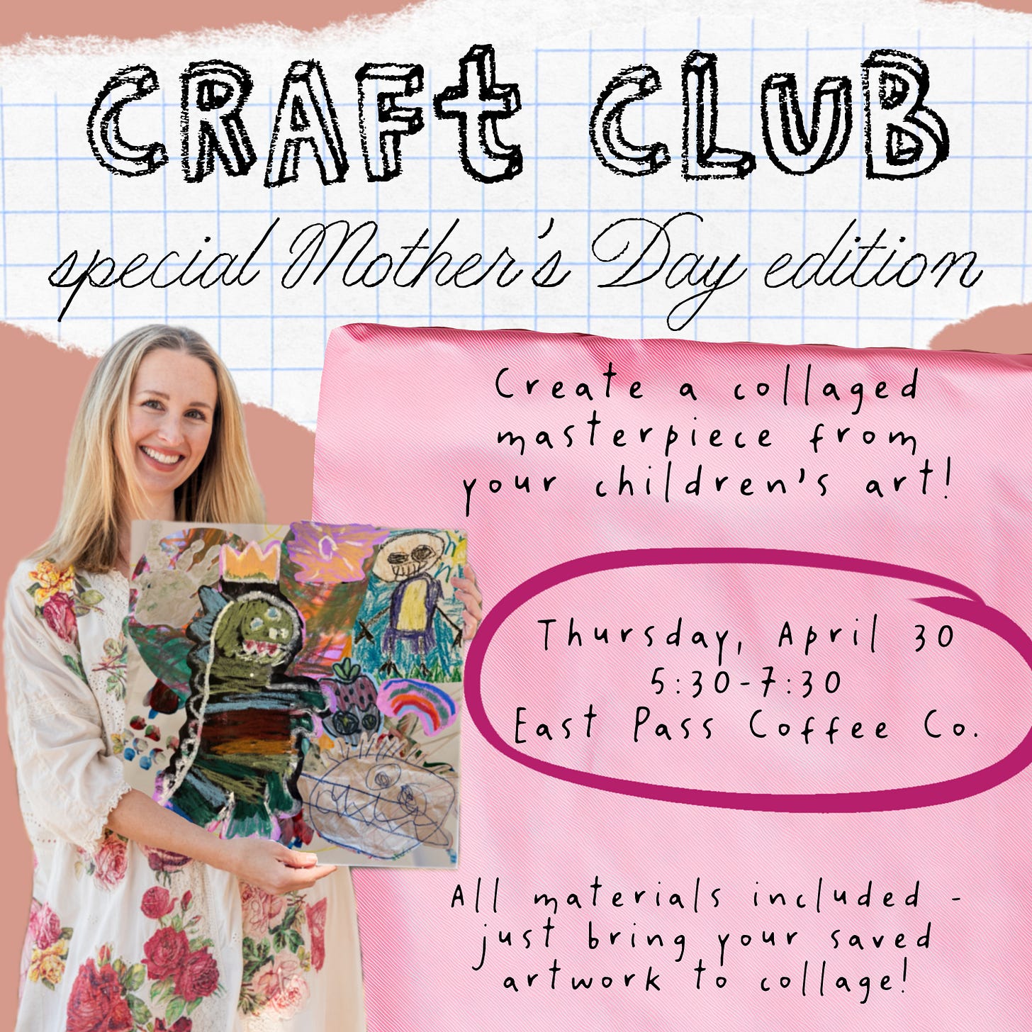 Our last craft club of the season is coming up later this month. You may have seen the Instagram reels or Tiktoks of moms collaging their children’s artwork to make a unique canvas for display. Well, that’s what we’ll be doing! Gather that pile of artwork and snag a ticket here before they are posted later this week. All materials will be included and beverages are available for purchase.